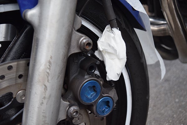 ペーパーウエス等で、付着しているブレーキフルードが周りに付かないように覆いましょう。