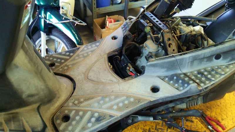 燃料ポンプ取り外しまでシート、サイドカバー、ステップボード等を取り外してゆきます。