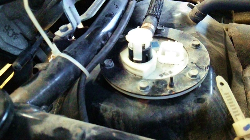 ガソリンタンクに装着されている燃料ポンプの配線カプラーとガソリンホースカプラーを外します。