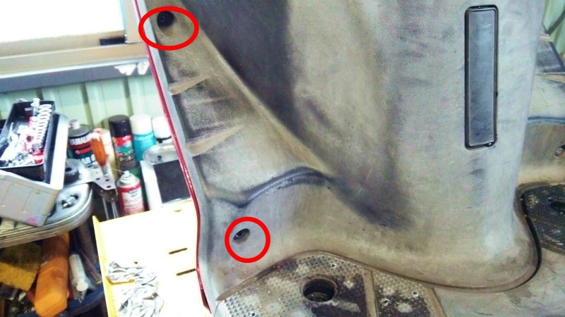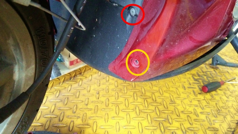 リアフェンダーの10mmボルト2か所とナンバープレート裏側のナットを外します。