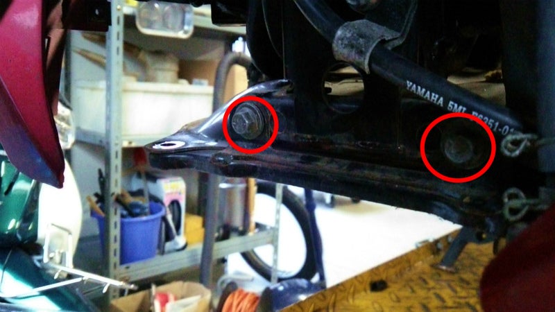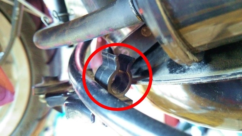 シリンダヘッド付近に2カ所と前輪の後ろ側 フレームとステーの部分2カ所のボルト 合計4カ所ボルトを外します。