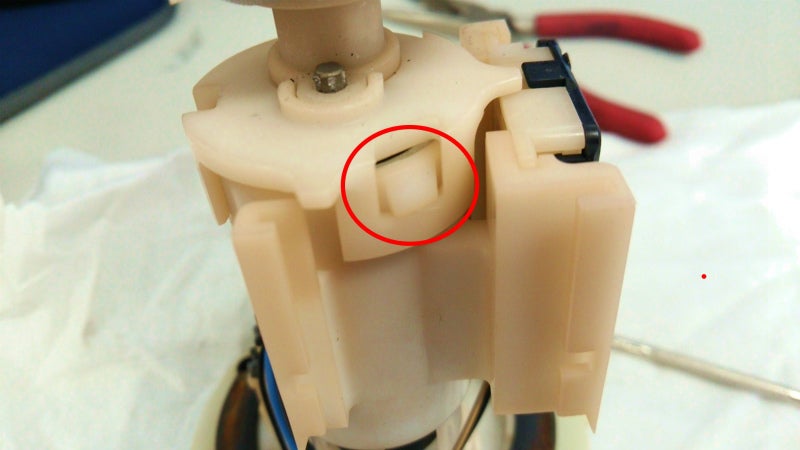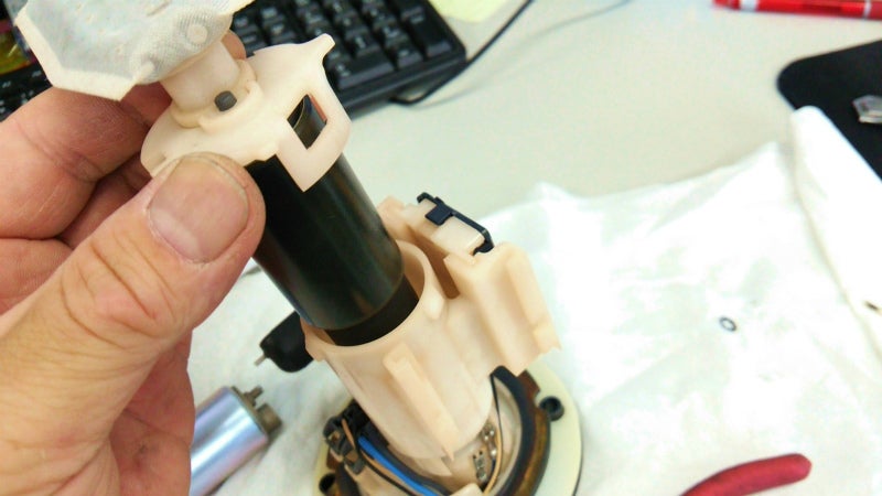 燃料ポンプ本体から出ている配線をモーターに取りつけてストッパーのはめ込みです。
