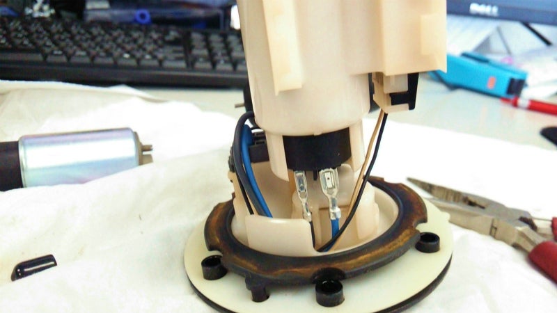 燃料ポンプ本体とモーターをつなぐ配線を2本外しておきます。