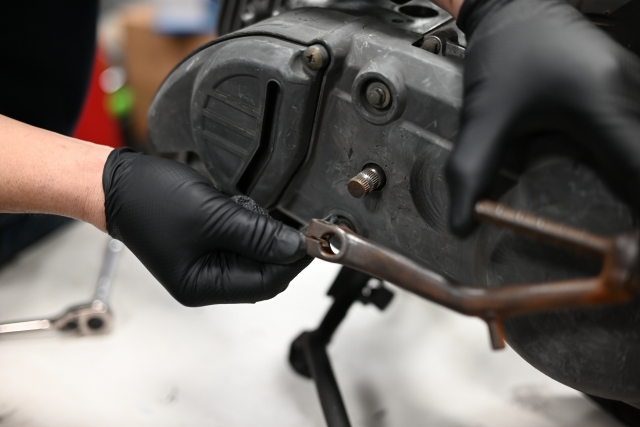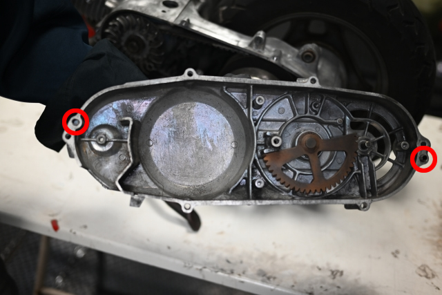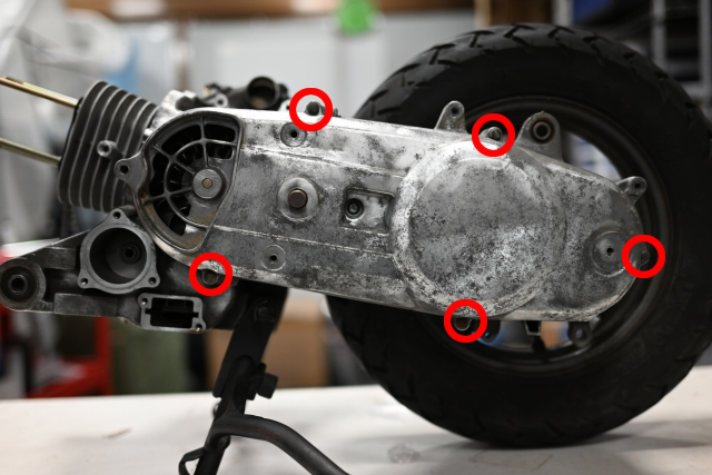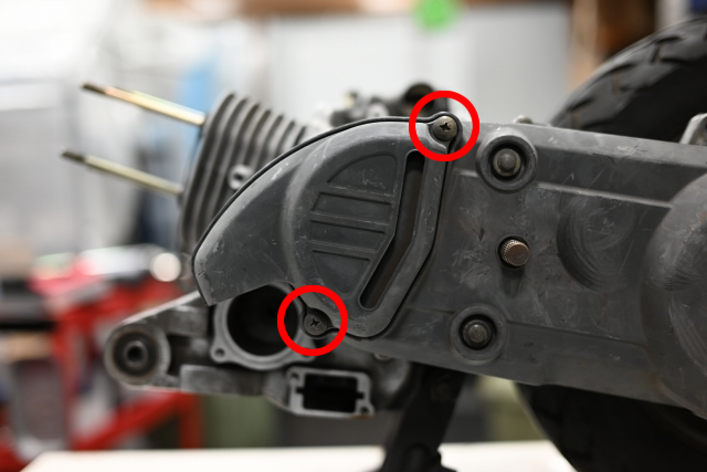 次に赤丸部分のクランクケースボルトを外します。