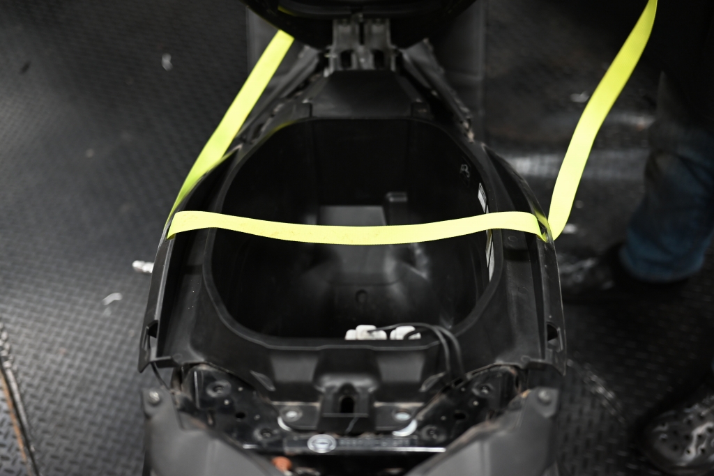 シートボックスにタイダウンベルトを引っかけます。
