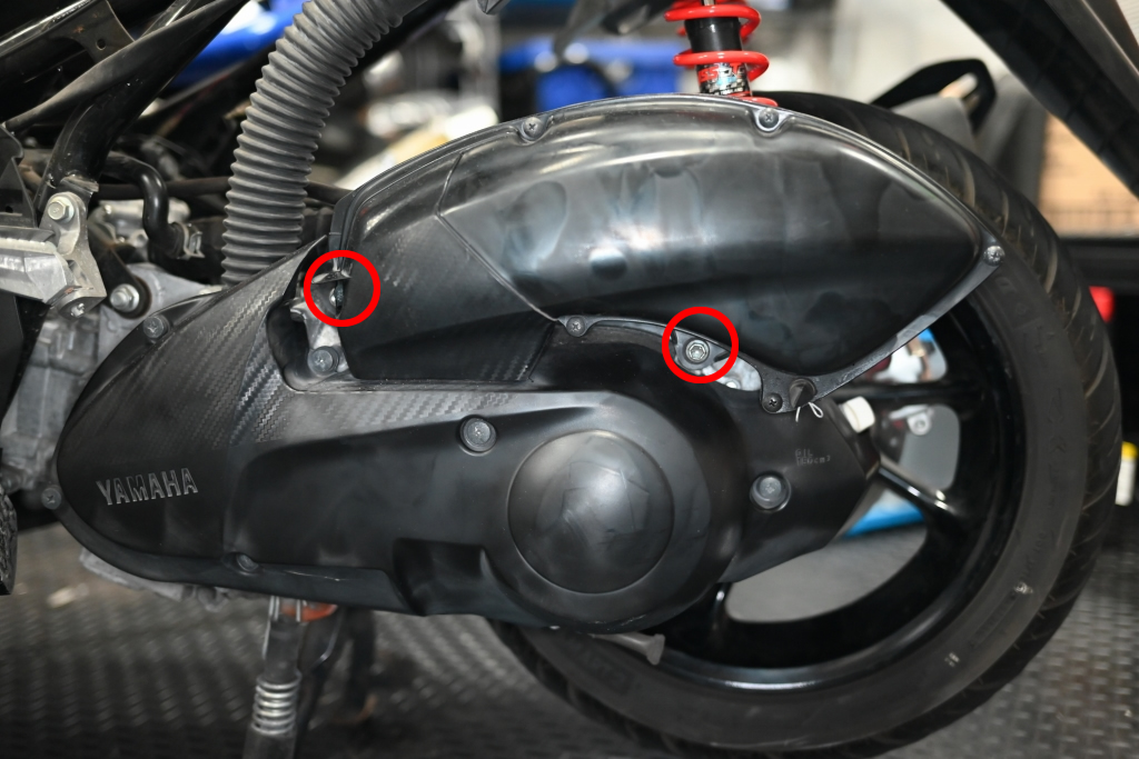 レッグシールドカバーの2本のボルトを外していきます。
