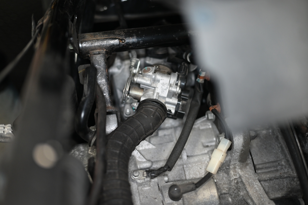 スロットルボディのホースバンドを外して、スロットルボディとホースを外せば、エアクリーナーボックスを外すことが出来ます。