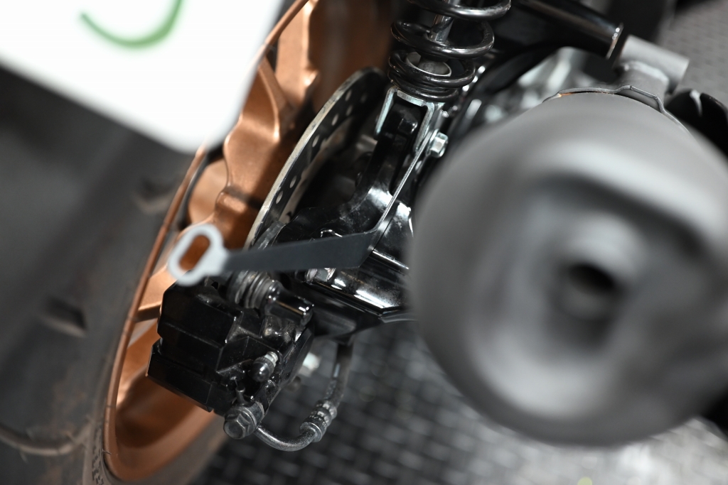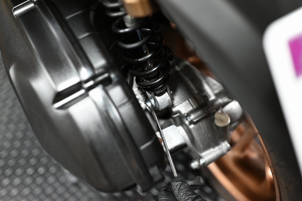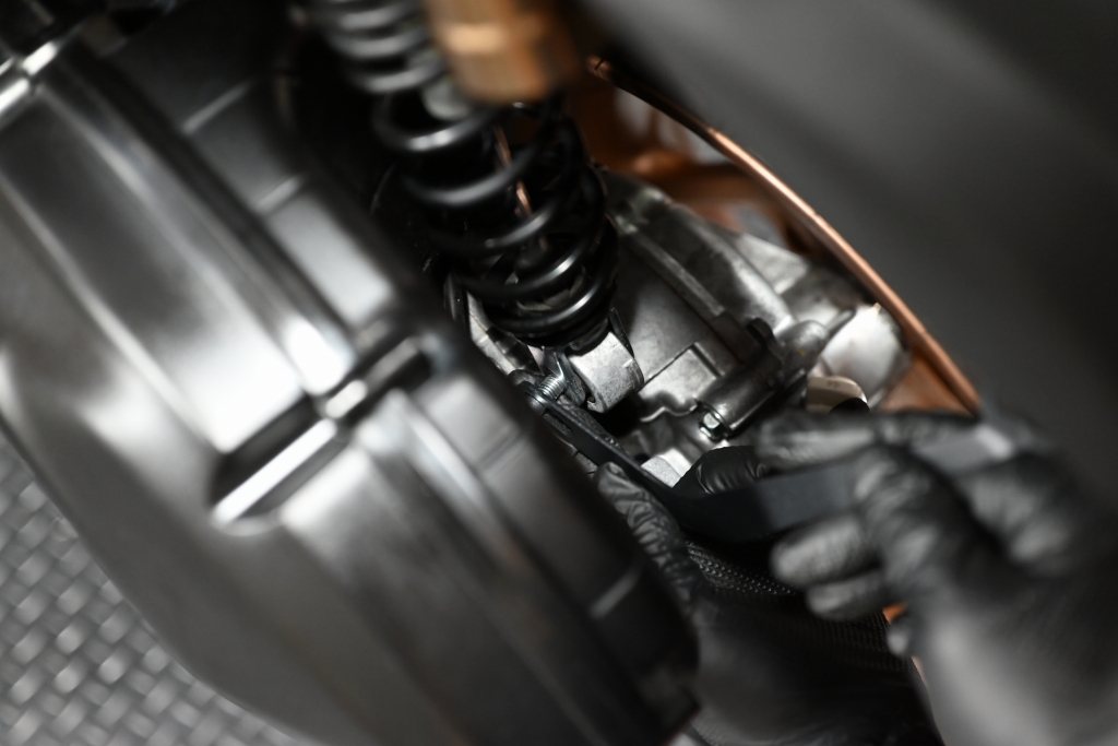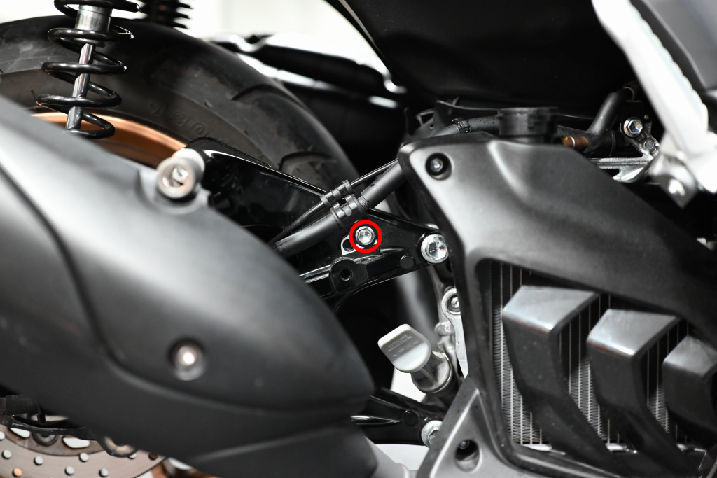 タイヤとインナーフェンダーが接触しな事を確認して、サスペンション下部ボルトを本締めして固定します。