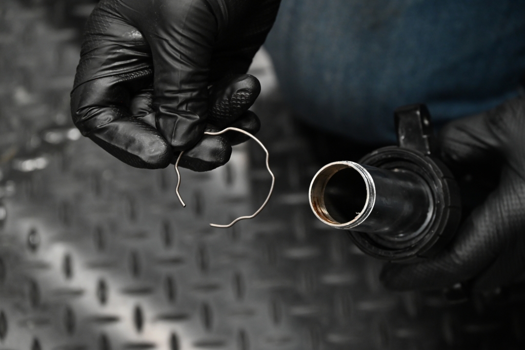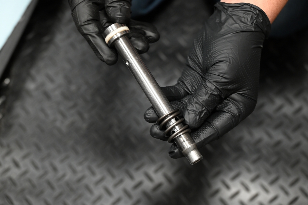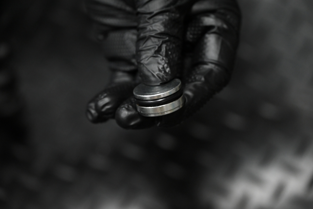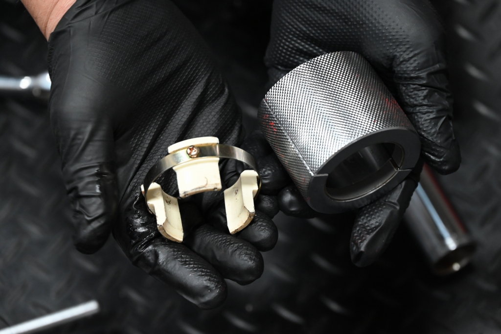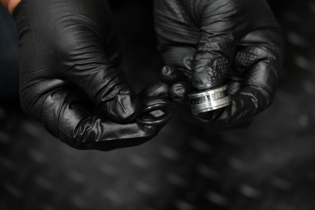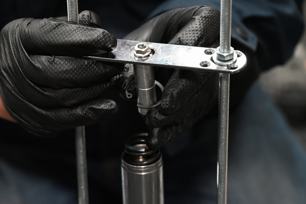 カラーにOリング組み付けてます スプリングコンプレッサーのスライド側ピストン部分にサーククリップを通しておきます。