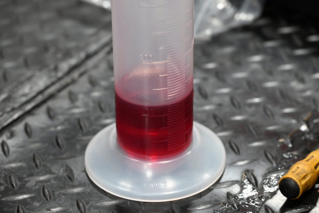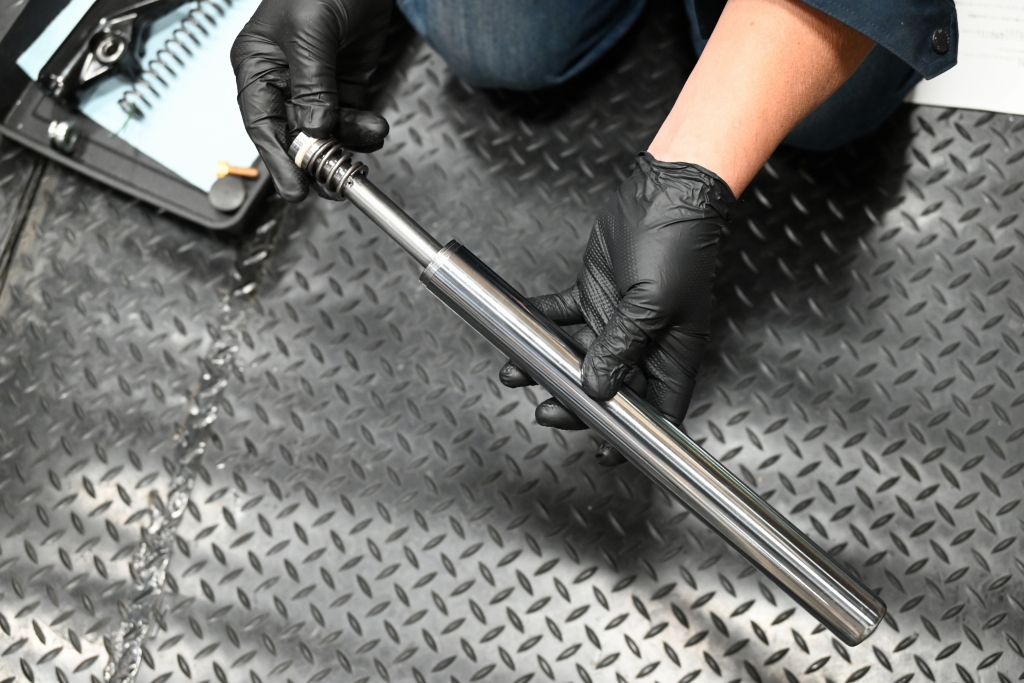 フロントフォークオイルを注入後ダンパーロッドにオイルがいきわたるように インナーチューブを伸縮してエア抜きを行います。