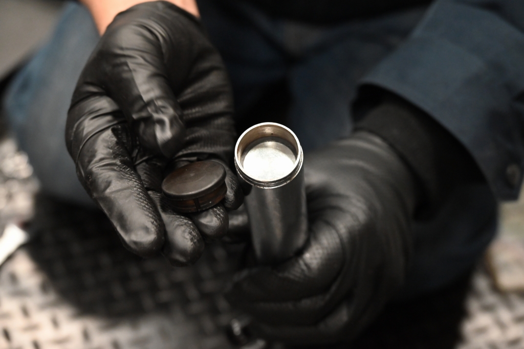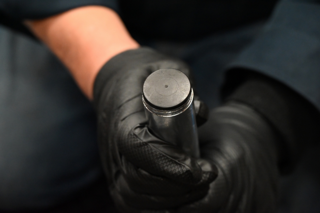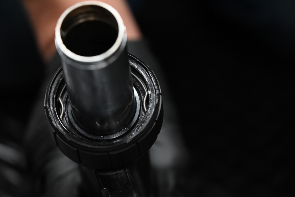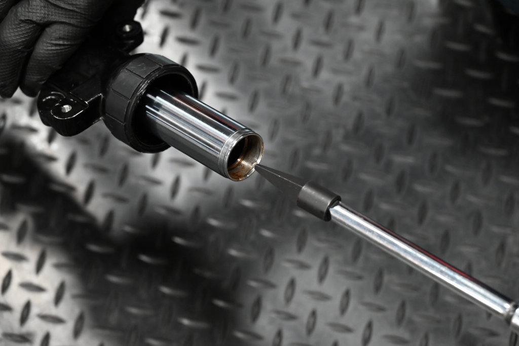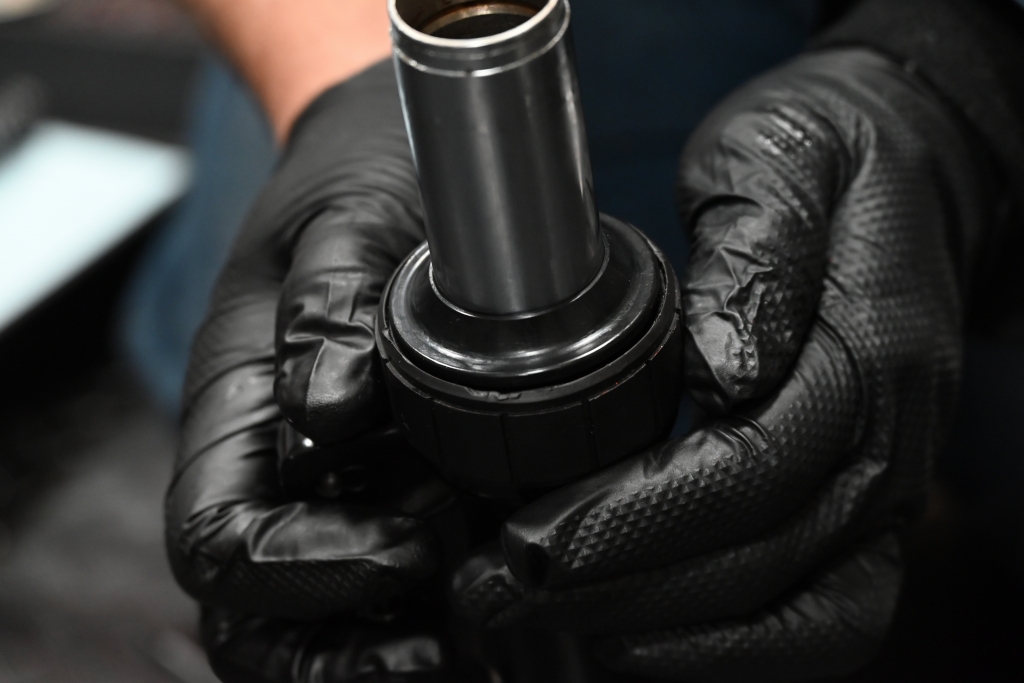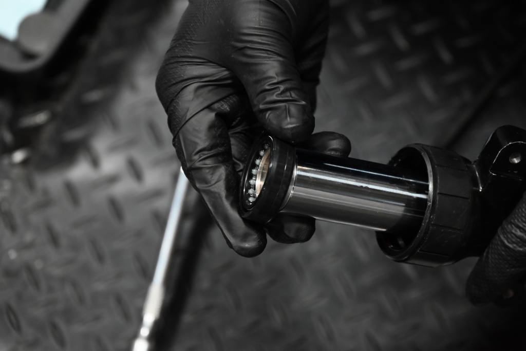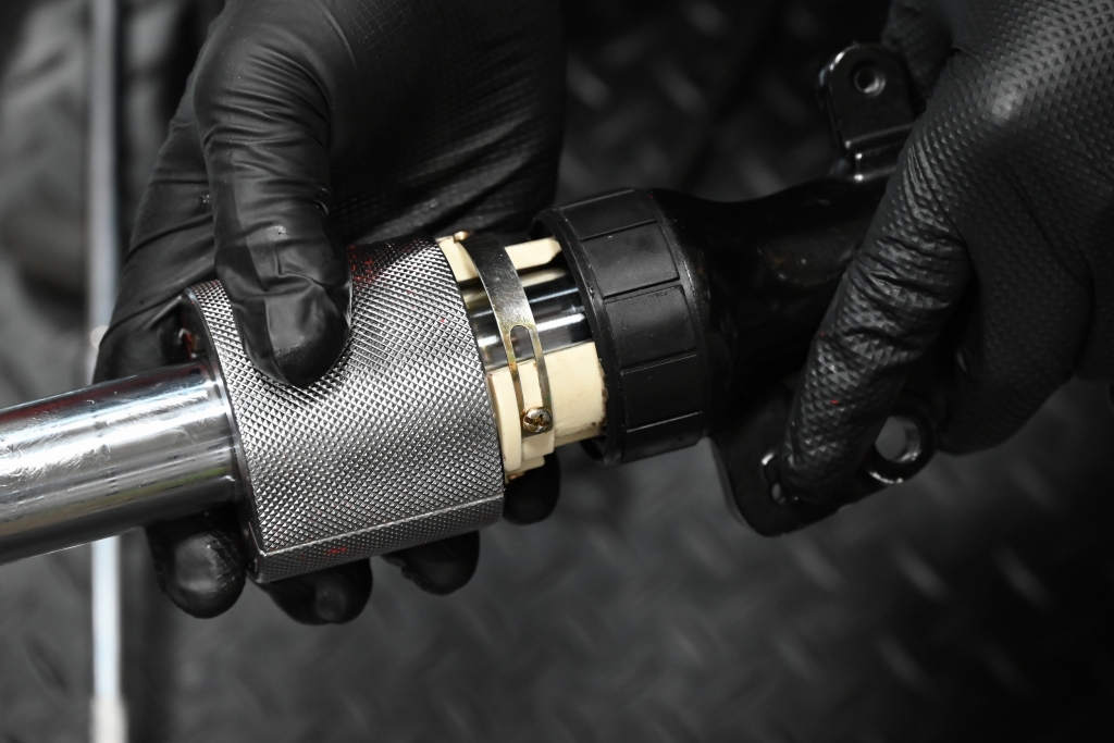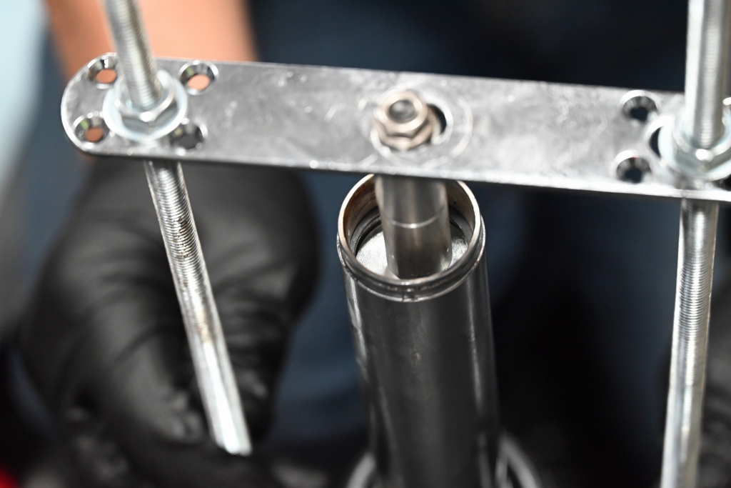 この時、インナーチューブ側から特殊工具を差し込み、ボルトが共回りしないようにインナー側から固定します。