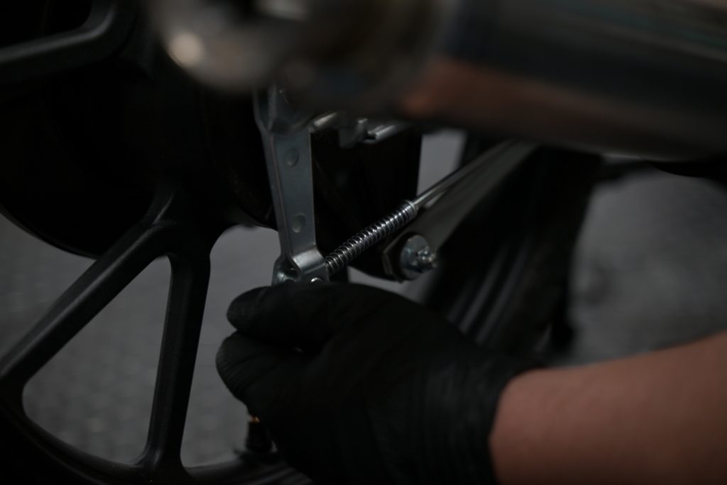 まずはリアブレーキのアジャスタボルトを緩めます。